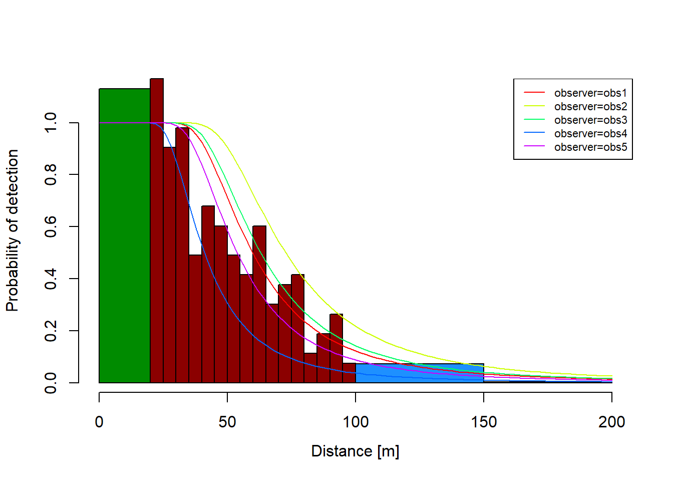 Figure 1: An estimated distance function relating Brewer’s sparrow observation distances (histogram bars) to individual observers (colored lines).