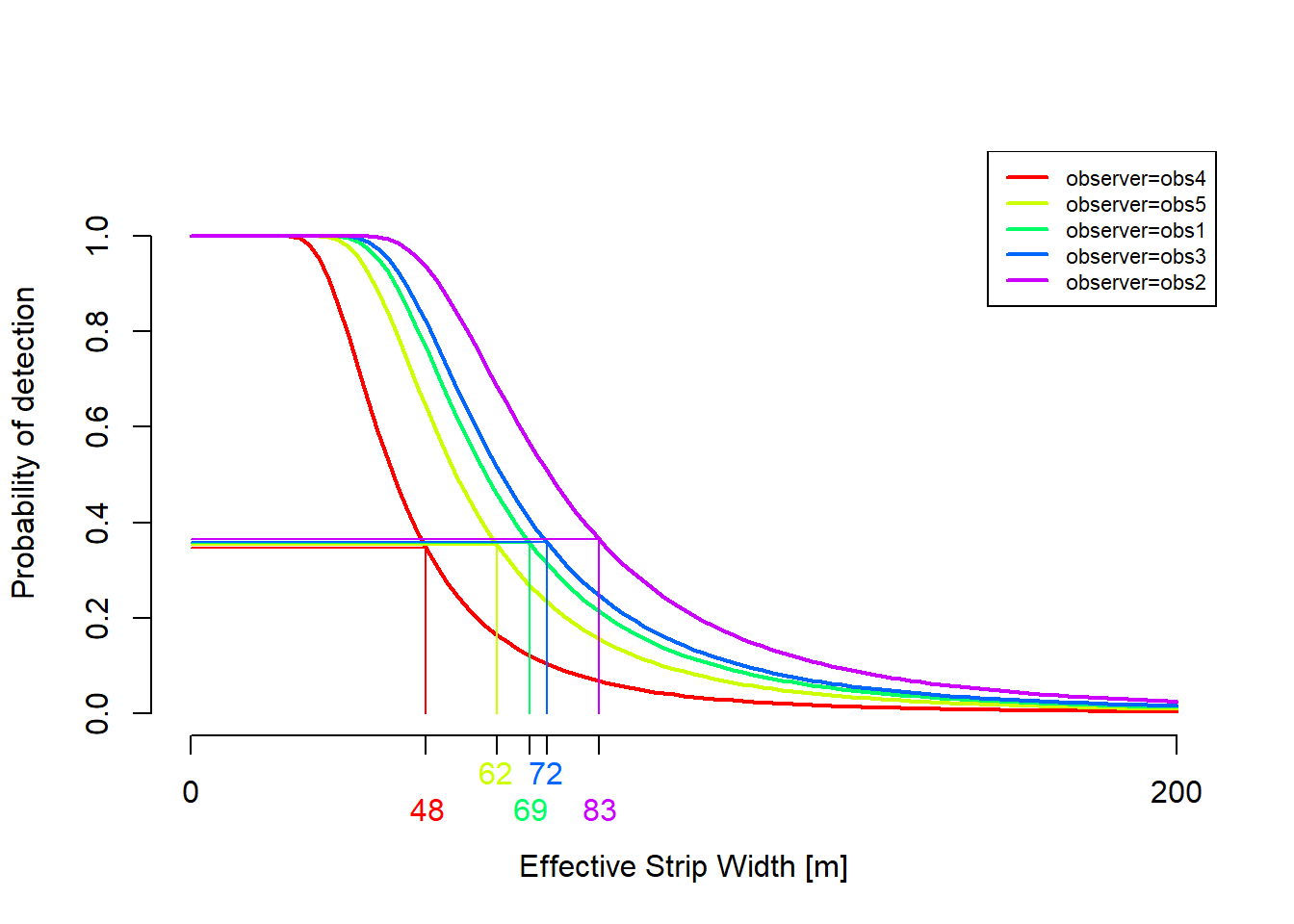 # Reorder by ESD for plottingord <-order(observerESD$esw)observerESD <- observerESD[ord, ] observers <- observers[ord,,drop=FALSE]# Plot distance functions and identify ESDmyCols <-rainbow(nrow(observerESD))plot(dfuncFit , newdata = observers , plotBars =FALSE , col = myCols , vertLines = F , xaxt ="n" , xlab ="Effective Strip Width [m]")axis(1 , tick =TRUE , at=c(0, observerESD$esw, 200) , labels =FALSE )axis(1 , tick =FALSE , at=c(0, 200) )dfuncHeights <-predict(dfuncFit , type ="dfuncs" , newdata = observers , distances = observerESD$esw ) # height of curves @ ESDfor( i in1:nrow(observerESD) ){axis(1 , at =round(observerESD$esw[i]) , line = (i %%2) -0.5 , tick =FALSE , col.axis = myCols[i] )lines(rep(observerESD$esw[i], 2) , c(0,dfuncHeights[i,i]) , col = myCols[i] )lines(c(0, observerESD$esw[i]) , rep(dfuncHeights[i,i], 2) , col = myCols[i] )}
