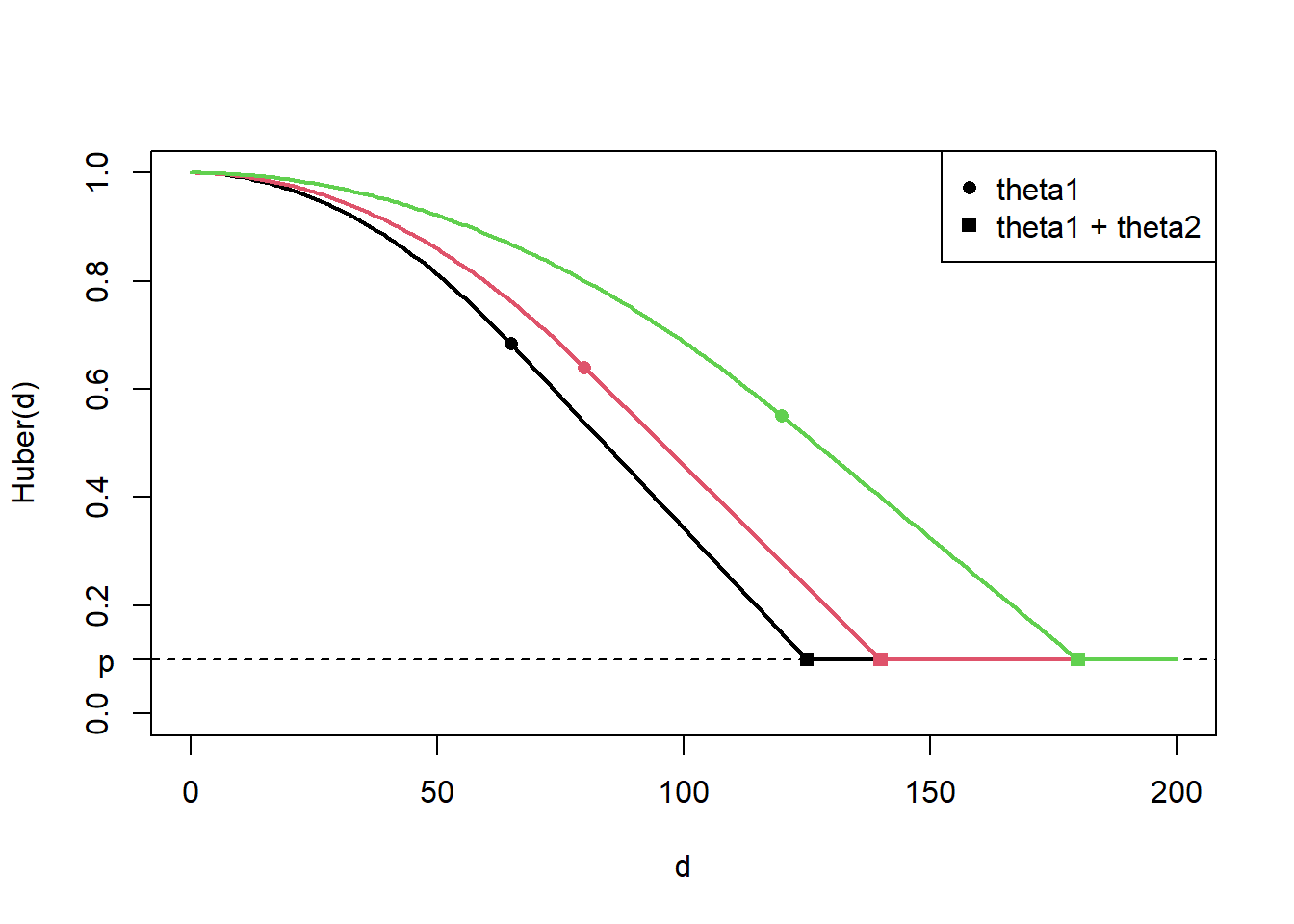 h <- y$L.unscaled # a matrixparams <- y$params # a matrixparams <- params[1,] # but params constant over rowsparams <-c(as.matrix(params)) # turn into vectornFuncs <-ncol(h)plot(range(d), range(h) , type ="n", xlab ="d", ylab ="Huber(d)", ylim =c(0,1))legend("topright" , legend =c("theta1", "theta1 + theta2") , pch =c(16,15) , col =1)abline(h = params[nFuncs +2], lty =2)axis(2, at = params[nFuncs +2], labels ="p", las =2)for(i in1:nFuncs){# Distance functionlines(d, h[,i], col = i, lwd=2)# Quadradic to linear transitions theta1 <-exp(params[i])points(theta1 , h[(theta1-0.1) < d & d < (theta1+0.01),i] , pch =16 , col = i )# Linear to constant transition Theta <- theta1 + params[nFuncs +1] # no link on theta2points(Theta , h[(Theta-0.1) < d & d < (Theta+0.1),i] , pch =15 , col = i )}