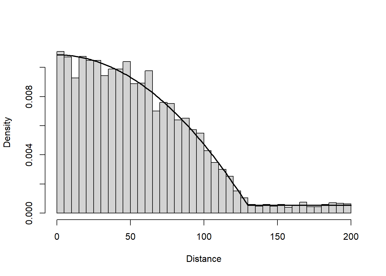 Next, we fit distance functions to the simulated data. To do that in Rdistance, we create an ‘RdistDf’ data frame.