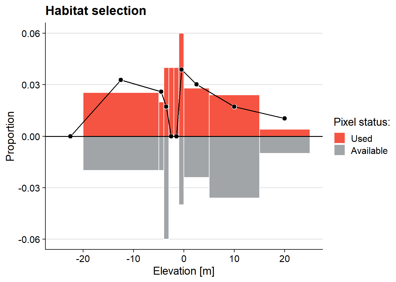 geom_smoothfunction. A smoothed function of the ratios is the one-dimensional resource selection function (RSF) for the resource plotted on the x-axis.